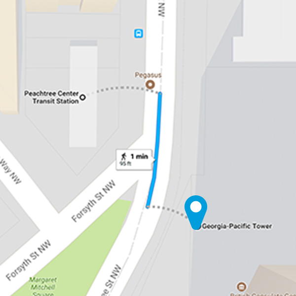 Take MARTA to Peachtree Center Station, which is on the Red/Gold lines, one stop north of Five Points Station. We’re located directly adjacent to the station in the Georgia-Pacific building.