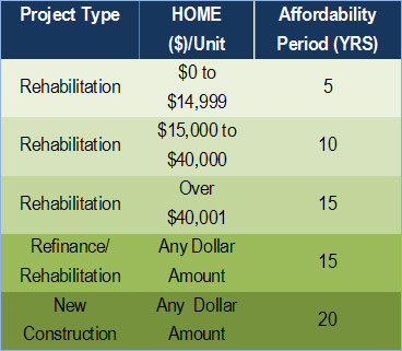 The HOME assisted project must meet the affordability requirements for not less than the applicable period specified in the chart below beginning after project completion. The affordability period is based on the HOME investment per unit.