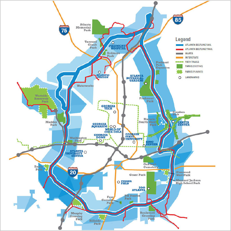 The Atlanta Beltline is a sustainable redevelopment project that is transforming the city. It will ultimately connect 45 intown neighborhoods via a 22-mile loop of multi-use trails, modern streetcar, and parks – all based on railroad corridors that formerly encircled Atlanta.