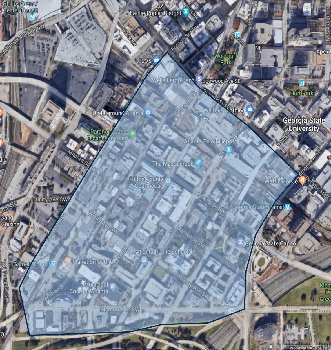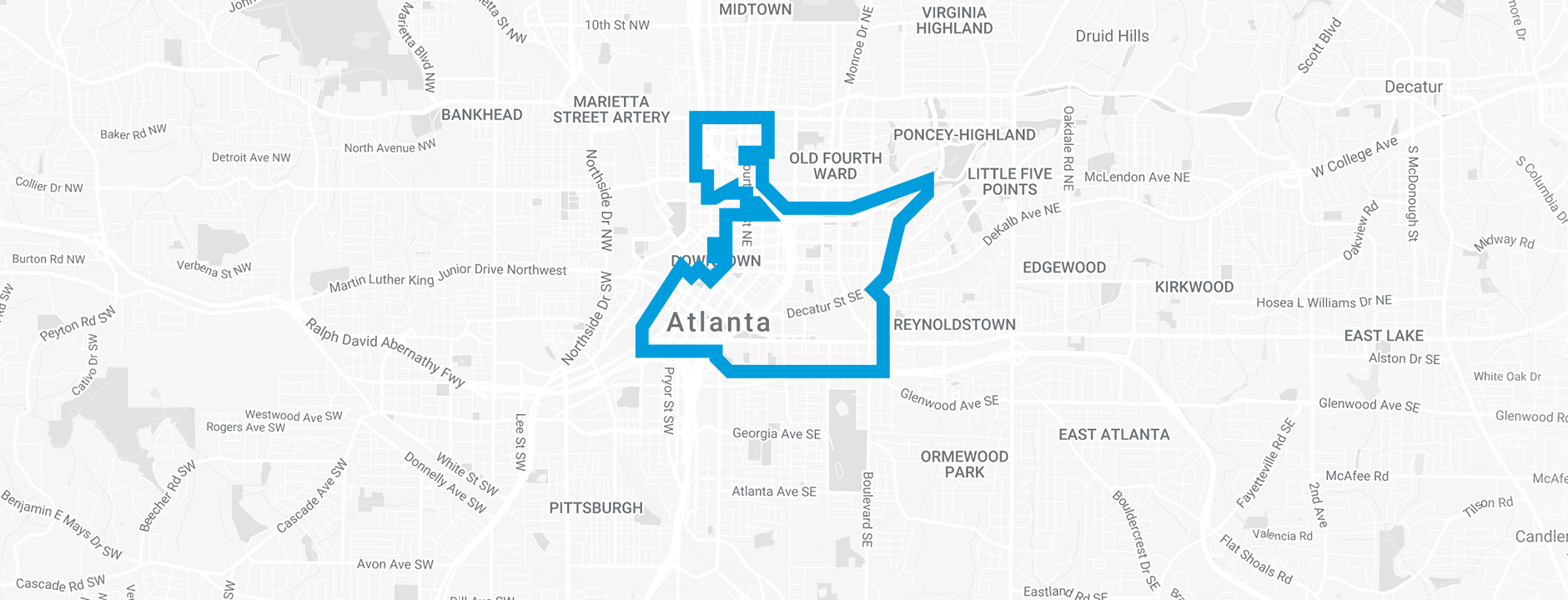 The Eastside TAD is located in the center of the City of Atlanta and includes the eastern and southern portions of Downtown and the adjacent neighborhoods of Sweet Auburn and Old Fourth Ward, as well as neighborhoods along the Memorial Drive corridor, including portions of Grant Park and Cabbagetown. This area is highly accessible, served by multiple MARTA stations, three interstate highways, and the Atlanta Streetcar.